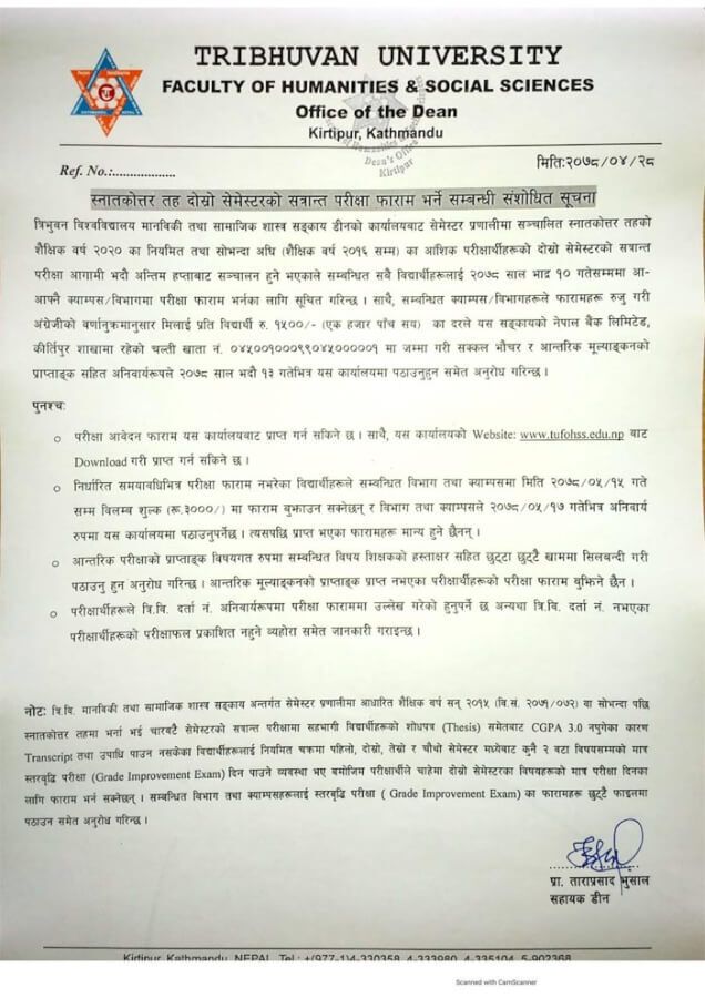 The Faculty of Humanities and Social Sciences at Tribhuvan University has issued a revised notification regarding the submission of examination forms for the Master of Arts (MA) Second Semester.