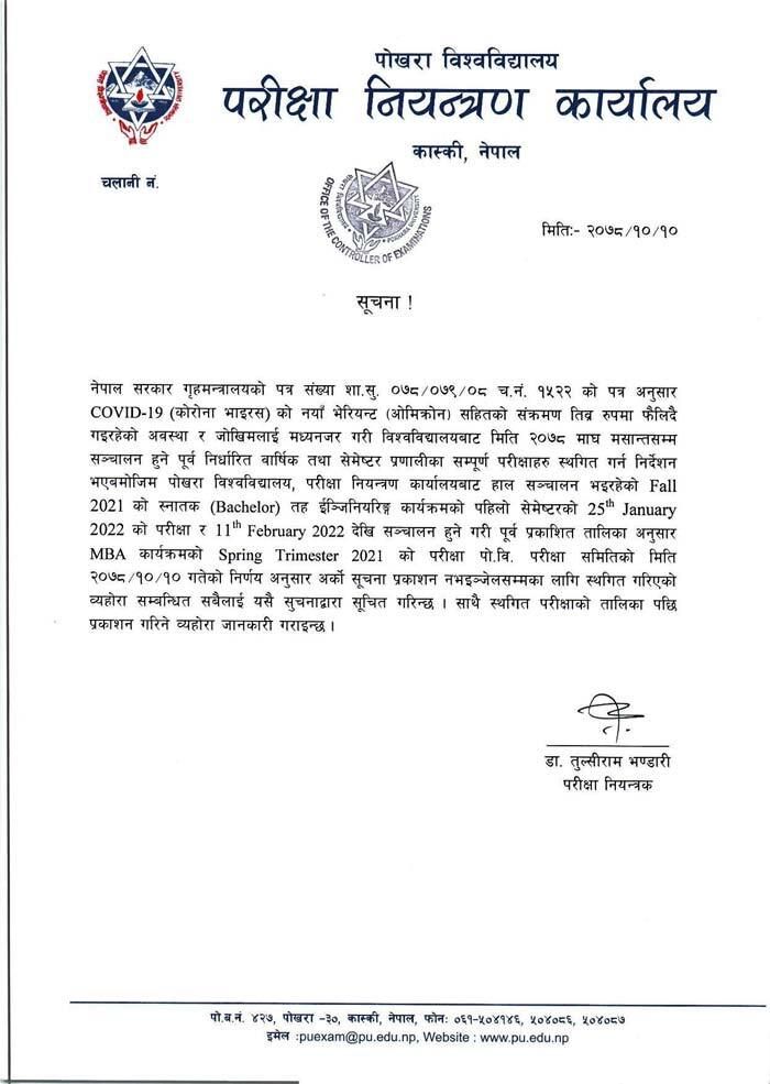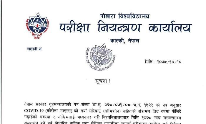 Due to an increase in COVID-19 infections, Pokhara University has decided to postpone all ongoing and scheduled examinations till further notice.