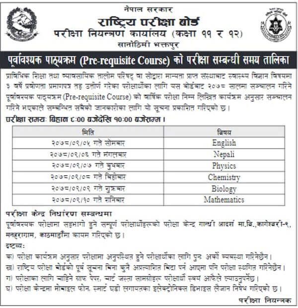 A pre-requisite course examination schedule for 2078 has been released by the Government of Nepal’s National Examination Board (NEB), Examination Control Office (Class 11 and 12), Sanothimi Bhaktapur.