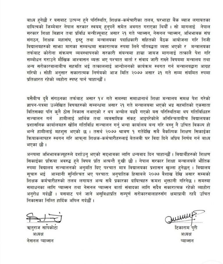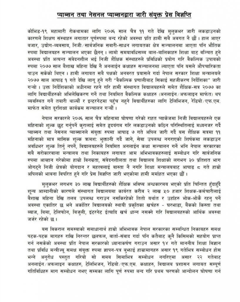 PABSON and N-PABSON have decided to shut online classes in all the affiliated schools starting from today. In the combined press-release, they also mentioned that all the teachers would be provided with unpaid home leave for an undefined period. They’re demanding the government to honor their demands, until then they said they do not have the capability to host online classes.