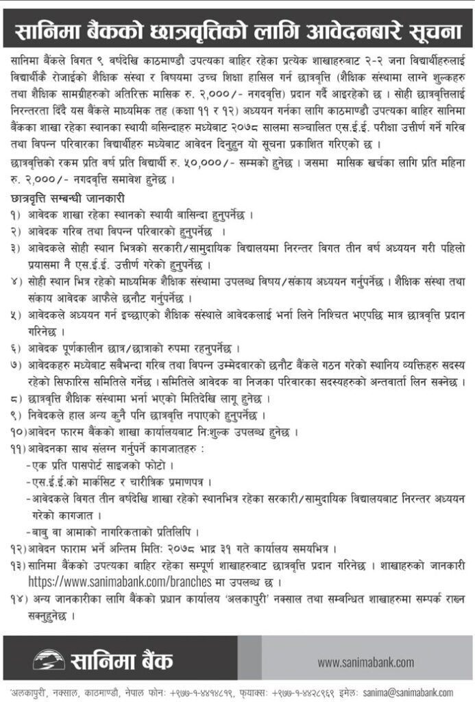 Sanima Bank has issued an announcement on scholarships for +2 students. According to the advertisement, the Bank is accepting applications for a scholarship program for recent SEE graduates. This scholarship has been offered by the Bank every year for the past nine years.