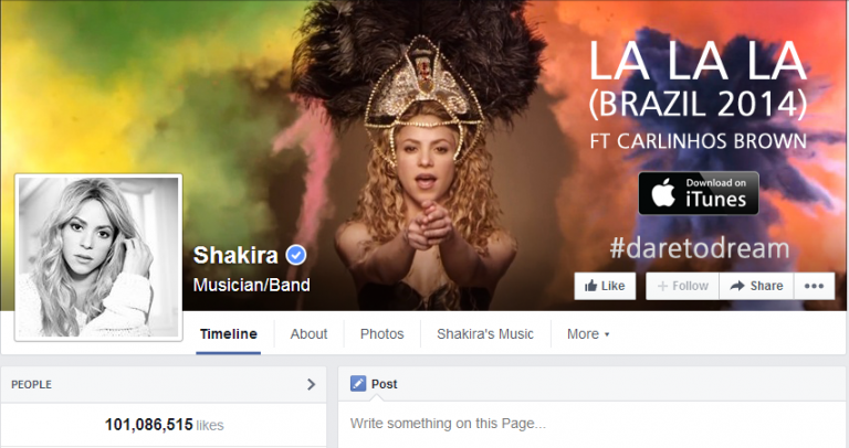 The popular Colombian singer has really broken the records to be the most popular person ever in Facebook. She is now the second most liked page in Facebook after hitting over 100 million likes, only behind Facebook’s own original page. She joined Facebook in 2007 and she is taking the lead. She does have a fair lead over her fellow competitors. She has taken lead over Eminem (91.9 million), Rihanna (89.1 million), Michael Jackson(76.9 million) and Katy Perry (72.5 million). Her most liked post reaching 3.6 million likes is a picture of of the singer standing in the Maracanã football stadium in Brazil, where she performed at the Closing Ceremony of The FIFA World Cup 2014 at Brazil.