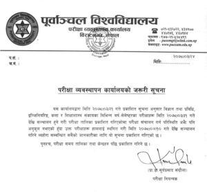 The Examination Management Office of Purbanchal University (PU) has issued a notice regarding the postponing of examinations planned to begin on July 15, 2021.