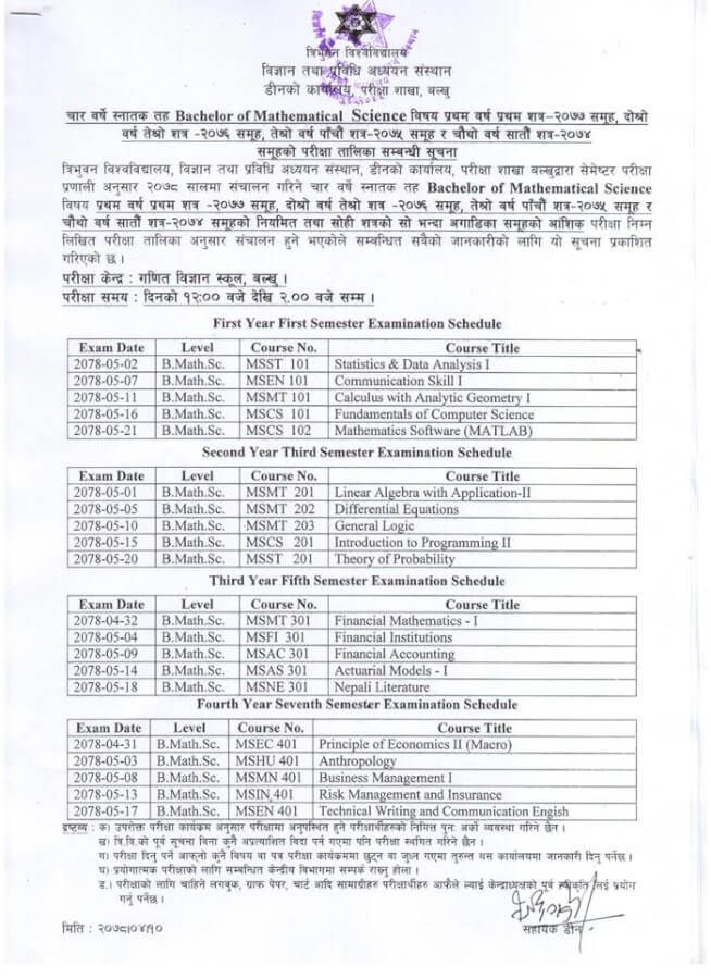 The examination schedule for the First Semester 2077 Batch, Third Semester 2076 Batch, Fifth Semester 2075 Batch, and Seventh Semester 2074 Batch of the Bachelor in Mathematical Science (B.Math.Sc) program has been published by the Tribhuvan University, Institute of Science and Technology, Examination Department, Balkhu.