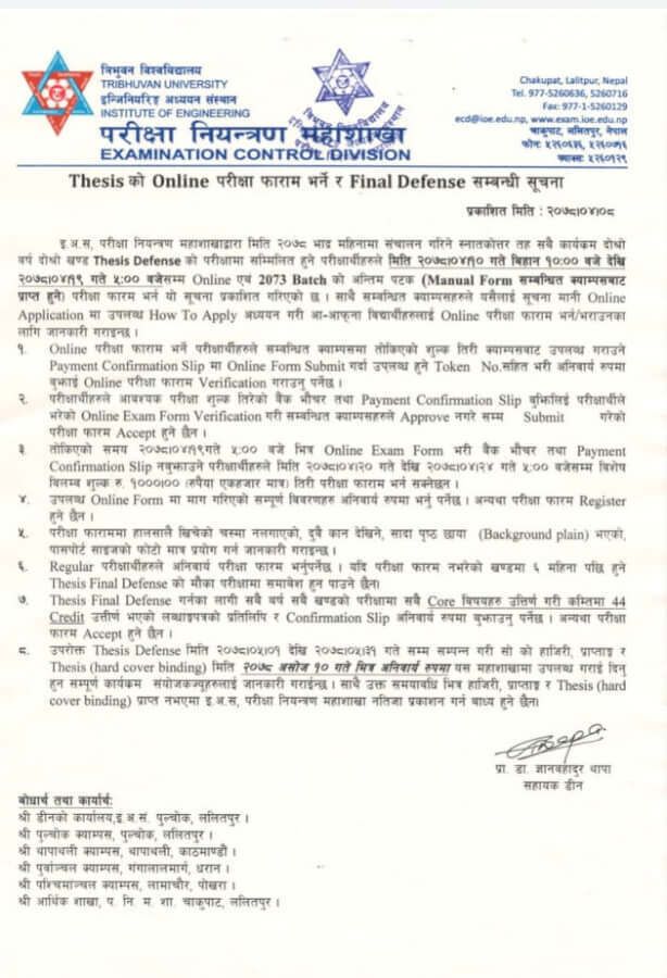 The Institute of Engineering IOE of Tribhuvan University (TU) has issued a notice regarding an online form for Thesis submission as well as information on Final Defense.
