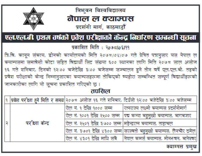Tribhuvan University’s (TU) Nepal Law Campus in Kathmandu has issued a notice regarding the examination center for the 3 year LLB First Year entrance examination.