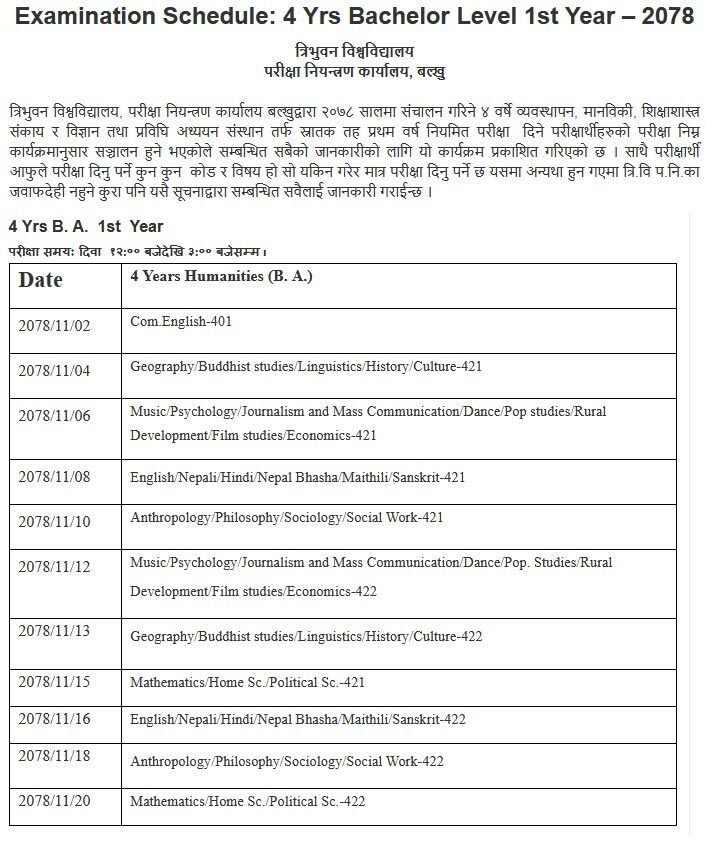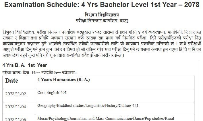 Tribhuvan University (TU) has published examination routine of BA (Humanities) first year 2078.