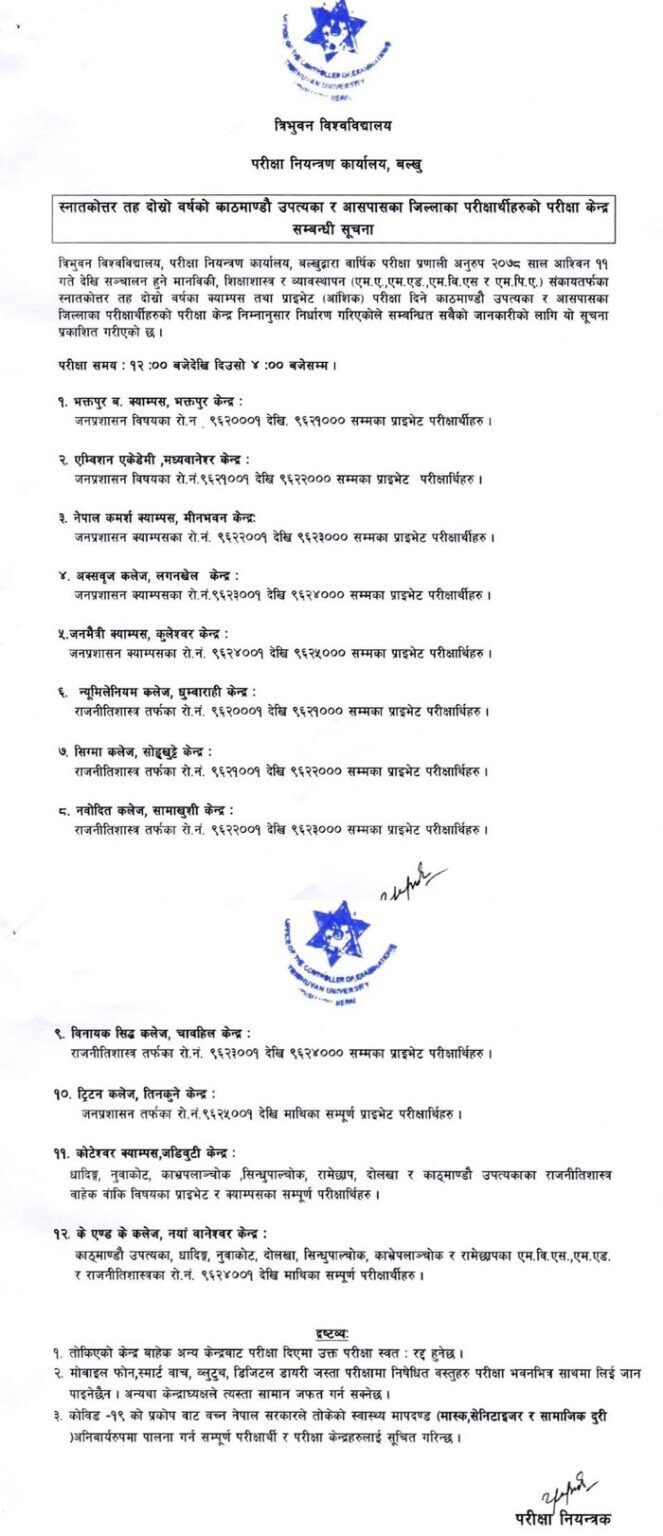 The exam center notice for Master level (M.Ed, MBS, MPA, and MA) Second year has been published by Tribhuvan University (TU) (Kathmandu Valley and nearby District).