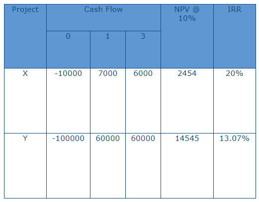 If we calculate IRR of these proposals it is 50% and 75% respectively, indicating that the project B is better. The reality is that A has a positive NPV while B is having negative NPV.