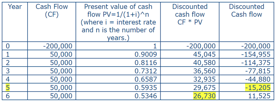Let us take Rs. 200,000 as initial investment and Rs. 50,000 as expected net cash inflow for the next 6 years. Let us assume the discounted rate to be 10% then the discounted cash flow will be calculated as follows.