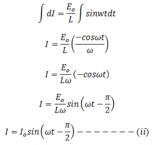 This is the form of alternating current developed in the purely inductive circuit. Equation i and ii shows that in a purely inductive circuit alternating emf leads the alternating current by π/2.
