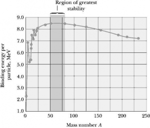 For Fe the binding energy per nucleon becomes highest which is 8.7 meV the elements whose atm. no . is greater than iron or mass no. greater than 57, binding energy slowly decreases. The elements whose atomic mass no. is around 200, binding energy becomes around 7meV. The element whose mass number is above 200 shows radioactive behavior. IT is so because these elements disintegrate spontaneously without any external agents. The element whose atm. mass no. is up to 57 cannot disintegrate but these elements undergo fusion process. The elements whose mass no. is around 57 to around 200 cannot undergo fusion process but they undergo fission process.
