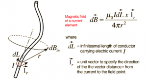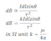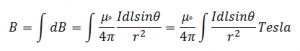 Consider a conductor through which a current I flows and let small elemental length dl at a source point. We want to calculate magnetic field at a point which is distance r from source point. θ be the angle between r and dl. Then from biot-savart law the magnetic field due to current carrying conductor is
