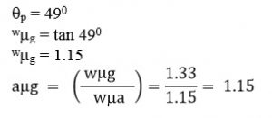 A beam of light travelling in water strikes an angle plate which is also immersed in water. When the angle of incidence is 49. The reflected beam is found to be polarized what is the refractive index of glass.