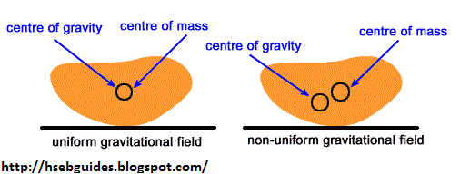 The centre of mass often confused with the centre of gravity. The two terms are so similar in many respects that one can use the two interchangeably. The centre of gravity of an extended object coincides with its centre of mass if the object is in a completely uniform gravitational field. If the body is not located in a uniform gravitational field, its centre of mass and centre of gravity will be at two different locations.