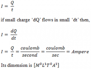 The rate of flow of charge in any specific direction is called current. If Q charge flows through a conductor in time t then current is: