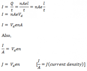 Consider a section of a metallic conductor of length l and cross-section area A. Let n be the no. of electrons per unit volume of the conductor. Then,