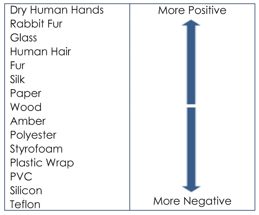When two objects are rubbed together we often see the exchange of electrons that is why you might have felt a quick shock while touching a metal doorknob or any other such items often when moving around a carpeted floor. This phenomenon is well explained by the triboelectric effect. When two objects are rubbed against one another if one object loses the electrons other is to gain it and vice versa. The table below lists the items which lose electrons (positive) and ones which gain electrons (negative):