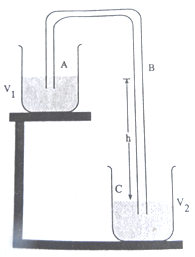 Siphon is an arrangement by which a liquid can be transferred from a vessel (V1) at higher level to a vessel (V2) at a lower level without disturbing the positions of vessels. One closed end of a bent tube filled with liquid is dipped in the vessel V1 and other end in the vessel V2 as shown in the figure. When the closed end is opened, the liquid starts flowing from the vessel V1 to V2 due to pressure difference between A and C. On account of this pressure difference, the liquid gets the needed potential energy.