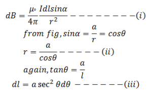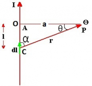 Consider an infinitely long conductor AB through which current I flows. Let P be any point at a distance a from the centre of conductor. Consider dl be the small current carrying element at point c at a distance r from point p. α be the angle between r and dl. l be the distance between centre of the coil and elementary length dl.