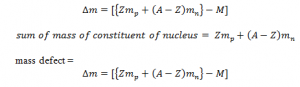 However, the mass of the nucleus is always less than the sum of the mass of constituent of nucleus. The difference in ass is known as mass defect. Let z be the no. of proton and Mp be the mass of the proton , A be total no. of constituent and Mn be the mass of neutron and ‘M’ be the mass of nucleus: