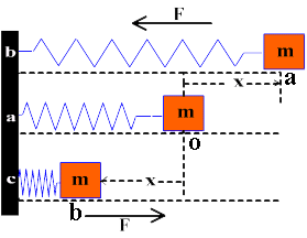 If we displace the mass ‘m‘ from its mean position ‘O‘ to point “a” by applying an external force, it is displaced by ‘+x‘ to its right, there will be elastic restring force on the mass equal to F on the left side which is applied by the spring.