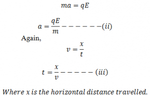 Let us consider a charged particle having charge ‘q’ moves with horizontal velocity ‘v’, enters in the region of electric field strength (E) as shown in the fig. As the charged particle moves in the electric field it deviates towards the positive plate. P1. Let y be the vertical distance which the charged particle just emerges from the electric field.