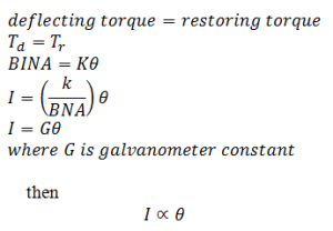 So the deflection of the galvanometer is directly proportional to the current on the rectangular coil. Hence we use a linear scale in the galvanometer.