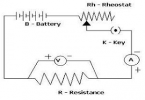 Ohm’s law can be verified by using a simple circuit as shown in fig. aside. A resistance R is connected in a series to a battery, ammeter and a rheostat. A voltmeter is connected in parallel across a fixed resistance R. When the key is closed, I current flows in the circuit and voltmeter and ammeter shows reading. By adjusting rheostat at different position different value of V and A are obtained. These values are noted and plotted on a graph paper and the graph shown below is obtained.