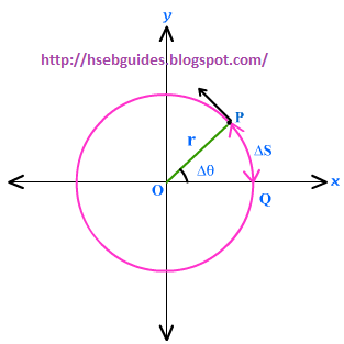 Consider a particle “P” in an object (in XY-plane) moving along a circular path of radius “r” about an axis through “O” , perpendicular to plane of the figure i.e. z-axis. Suppose the particles moves through an angle Dq in time Dt sec.