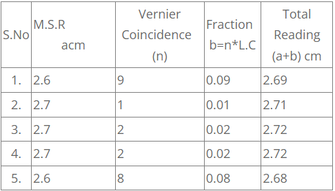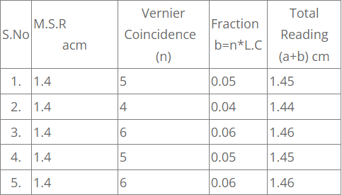 Take the readings, keeping the cylinders between jaws 1,1 at different positions. Post the values of M.S.R and vernier coincidence (n) in the table. Take at least 5 readings, get the average of these 5 readings which is mean length(l )of the cylinder.