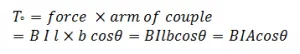 Thus the torque acting on a coil in a magnetic field depends on the number of turns, area of current loop, strength of current and magnetic field.