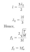 In this mode of vibration the string vibration in two segments. Thus there are three nodes and two antinodes between of string and l1 be the wavelength of wave in this mode of vibration.