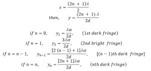 The difference of distance of conservative bright fringes from the center of fringe gives the width of dark fringe.